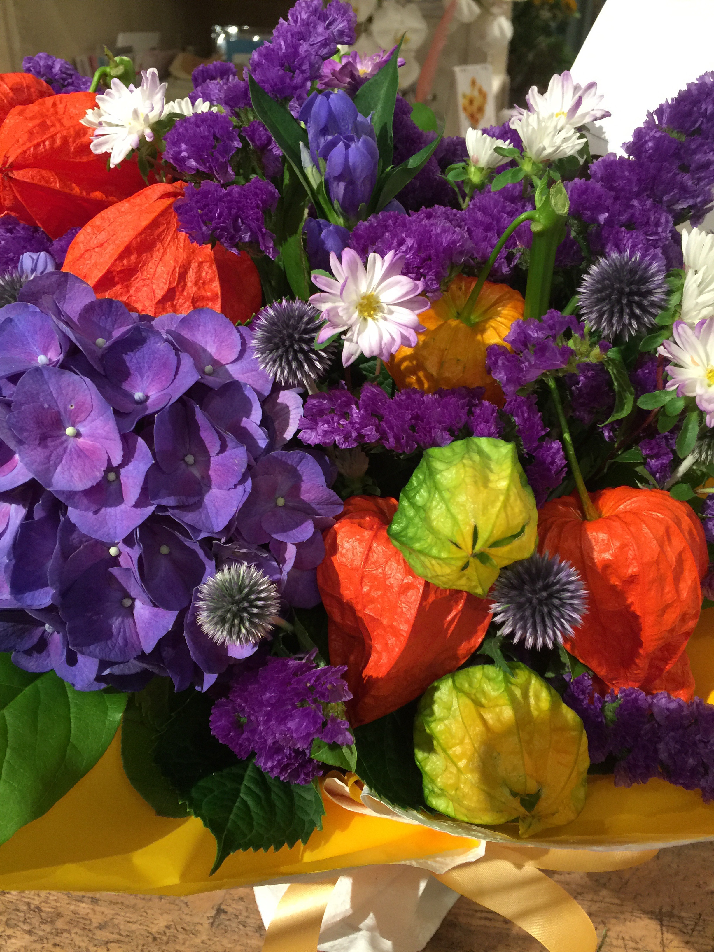 今日のアレンジメントはワンちゃんのお悔やみのお花です。